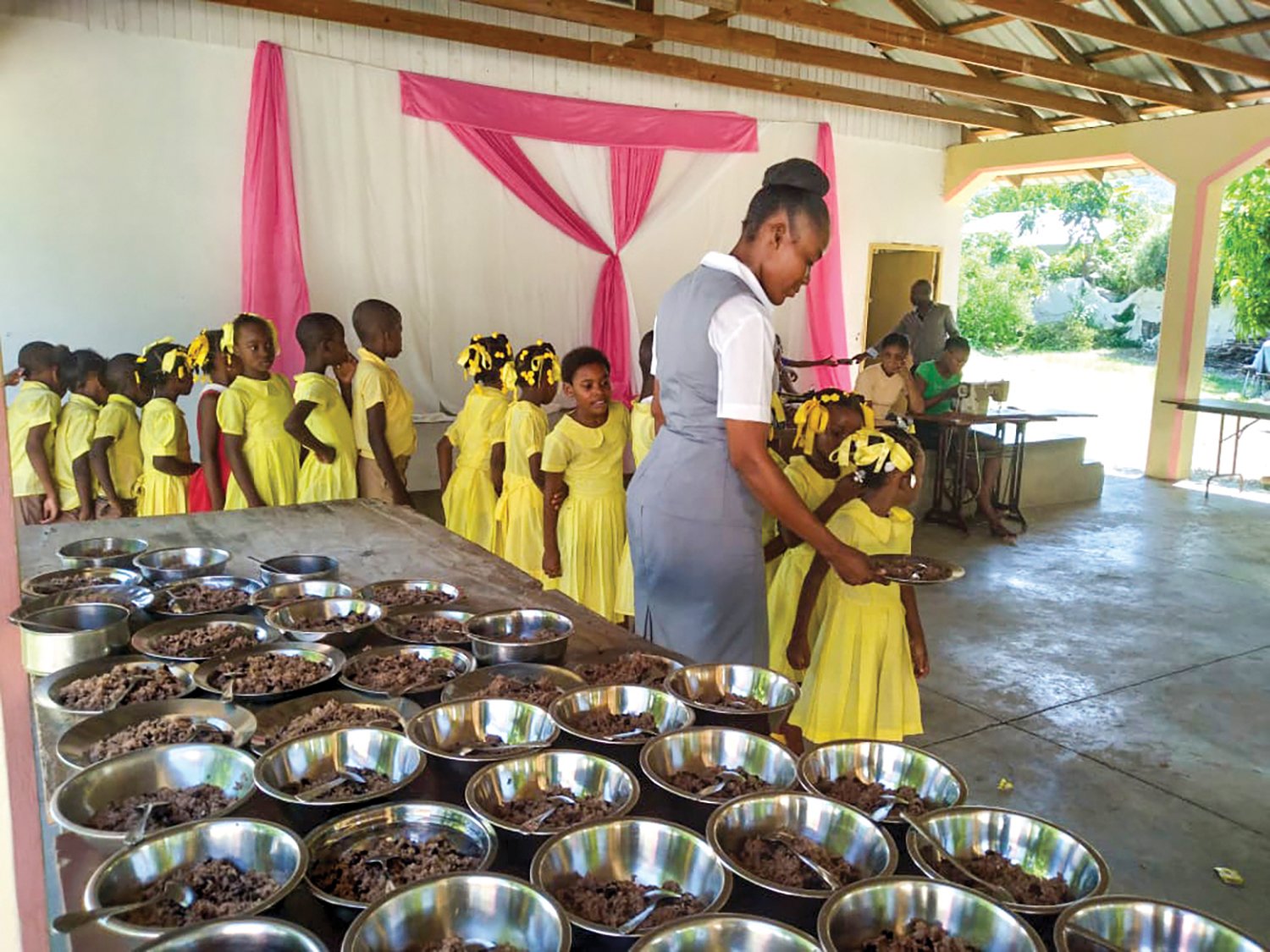 The students from L’Acul, Haiti, line up to enjoy a lunch prepared for them.